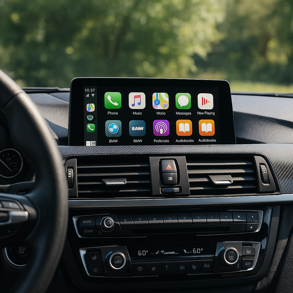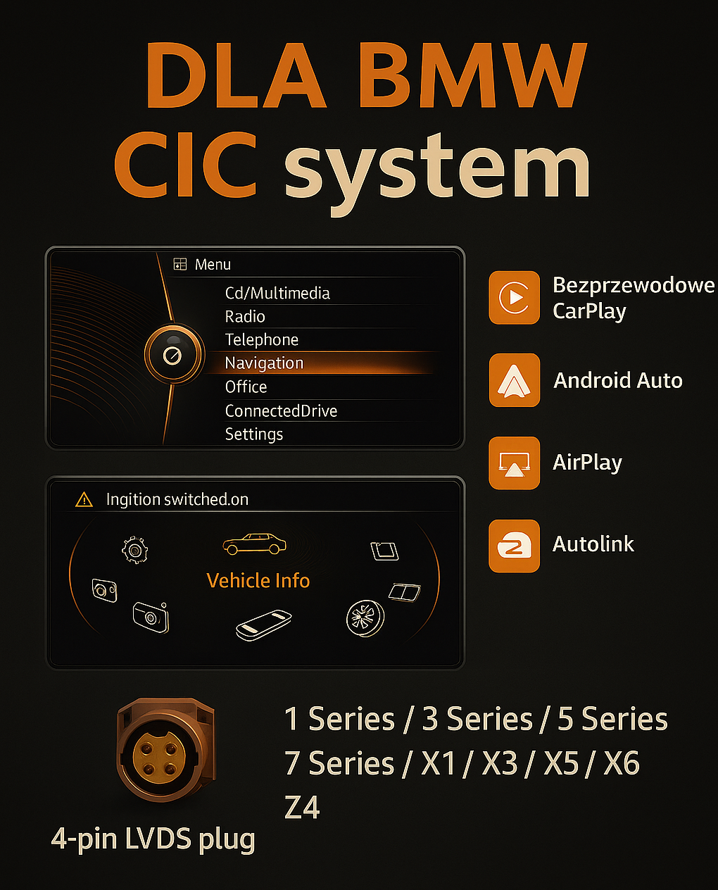 Dodaj Apple CarPlay i Android Auto do BMW z systemem CIC bez wymiany jednostki. Moduł integruje się z iDrive, działa z fabrycznym ekranem i sterowaniem z pokrętła/kierownicy. Montaż typu plug & play – bez cięcia wiązek.