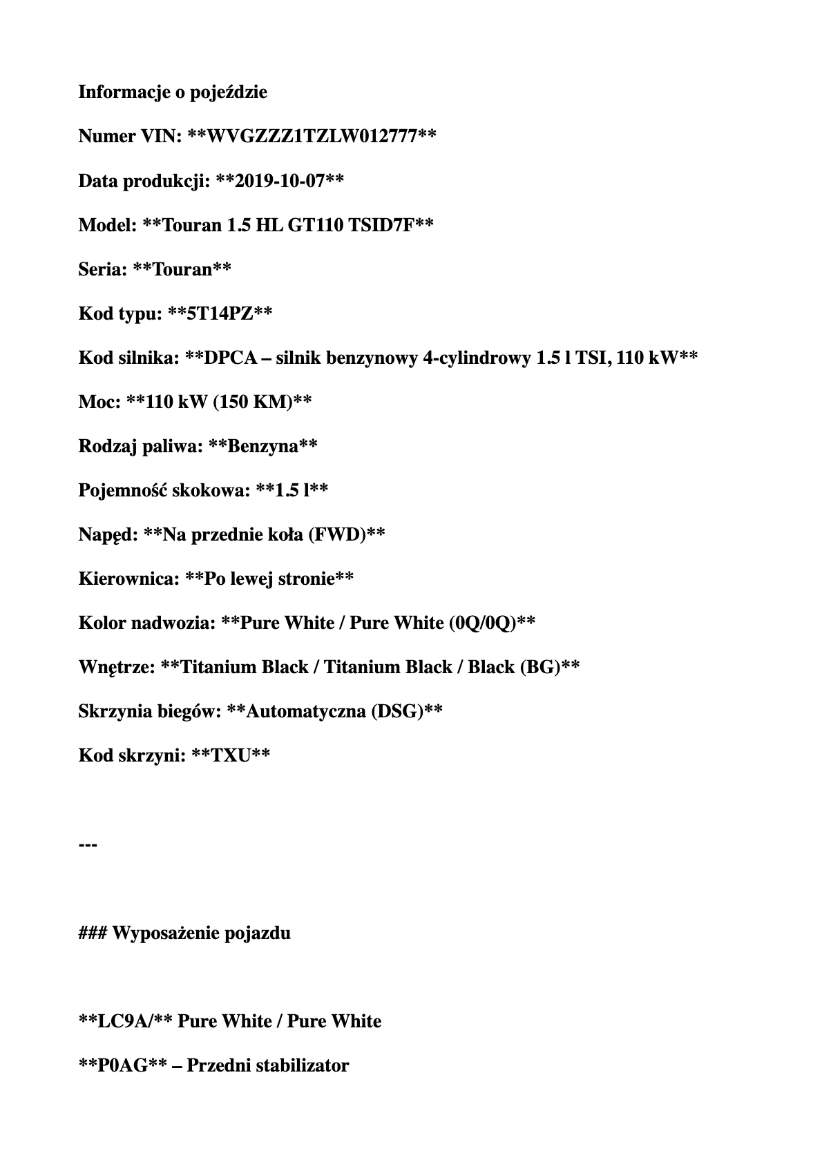 Planujesz zakup Volkswagena i chcesz potwierdzić fabryczne dane po numerze VIN? Otrzymasz czytelny raport PDF w języku polskim z pełną specyfikacją pojazdu.